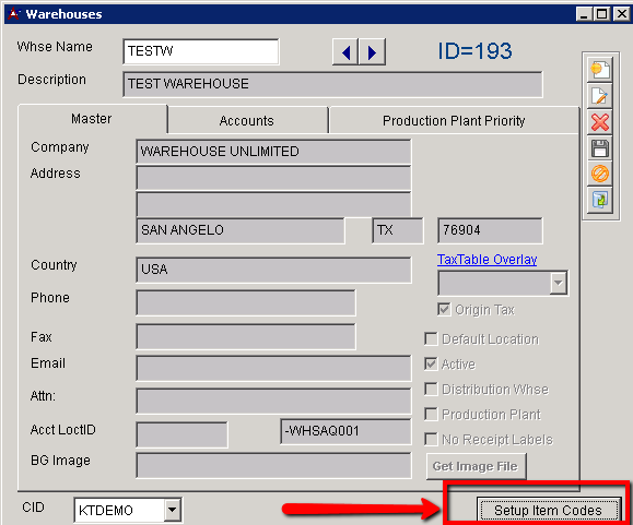 Setup Item Codes for new Warehouse - Click for larger image