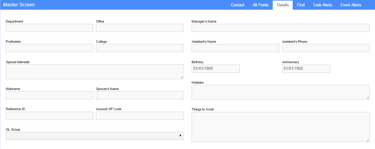 "Find Now!"The results grid at the bottom of the screen will be populated with all of the matching information. Then to view any additional information assciated with a contact in the results double-click on the contact, to be directed to the Main tab.