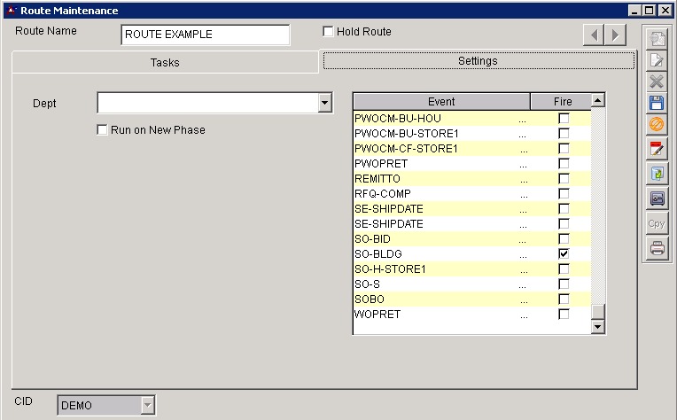 The settings tab of the Route Maintenance screen will control what event in the system starts the route. Routes can be manually started from different areas of Adjutant, but for an event to start a route, it must be selected on this screen. The events that show up in the list to choose from are generated from the Event List rule.