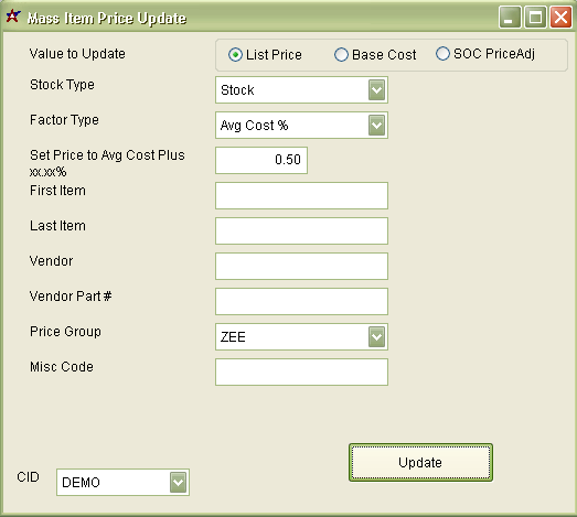 Function The Mass Price Update tool allows you to update the base cost or list price of items in the Item Master.
