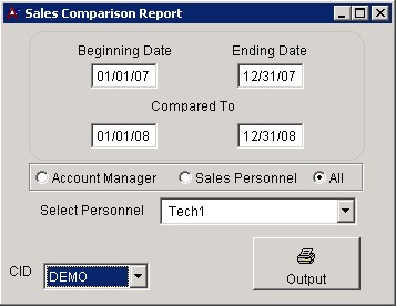 Sales Comparison Report screen allows user to generate sales reports for two different time periods entered.