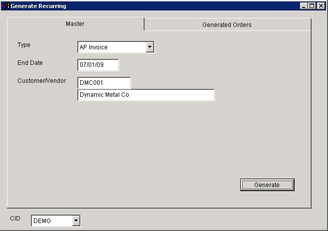 This screen is used to create recurring purchase and sales orders that have been previously set up.