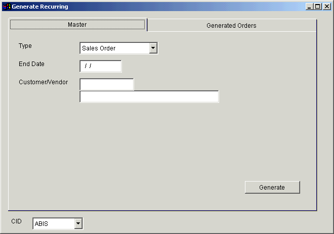 This screen is used to create recurring purchase and sales orders that have been previously set up.