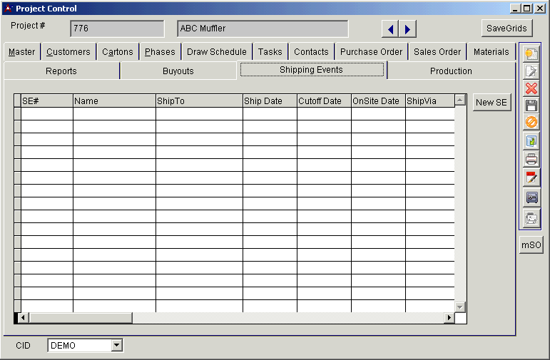 SE#: The number of the selected shipping event. Adjutant automatically assigns shipping numbers with the project number, a hyphen and a sequential letter (for example, "757-A"). The SE# also appears under the "SE#" column in the grid of Shipping Events, and the sequential letter appears under "Suffix".