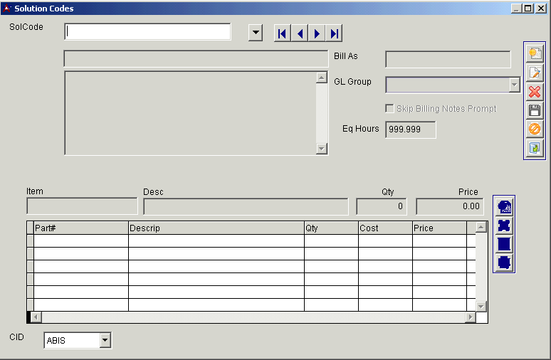 Function: This screen is used to add/edit/delete solution codes. Solution Codes are used to standardize records of work performed and flat-rate a service order.