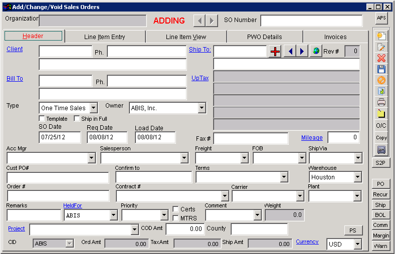Function The Sales Orders Screen is used to add, edit, and void sales orders. The Header tab is used to enter the basic information that starts a sales order.