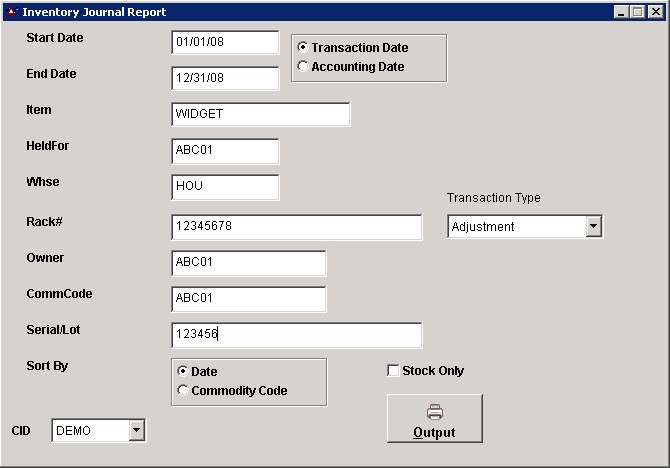 Function Inventory Journal Report screen allows user to generate a detail report journal by item number, time frame or location