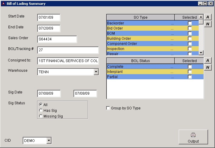Bill of Lading Summary screen generates a shipping report for the specific dates which includes Customer Name, Order#, B/L#, Total Weight, Carrier, and Status of the shipment.