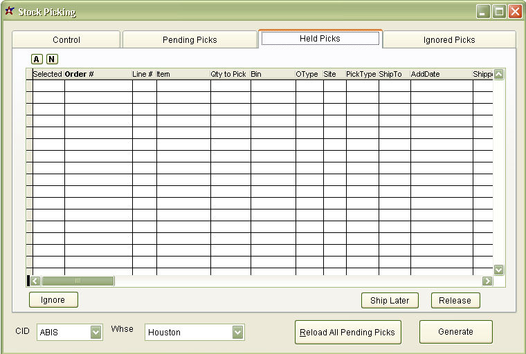 Function The Pending Picks window generates picklists and sends them to the wireless hand-held scanners in the warehouse. The Control tab is the main screen for processing picklists.
