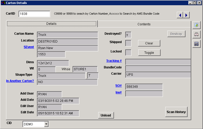 Function The Carton Details screen provides history and content information about a specific carton.