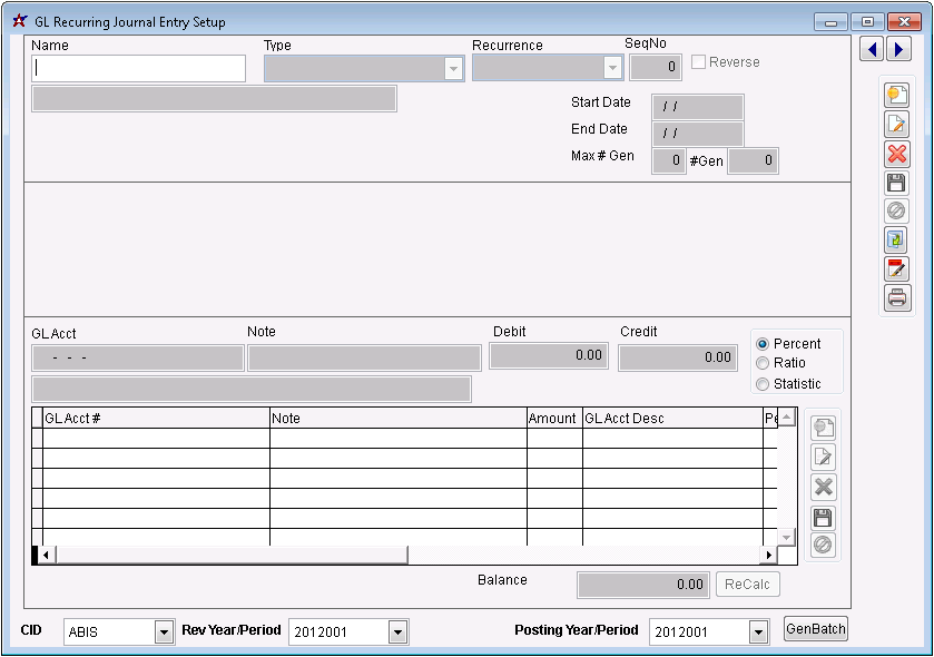 Default Menu Location: Maintain >> General Ledger >> Recurring Journal Entries