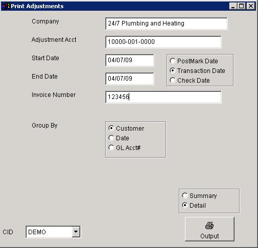 Function AR Adjustments Report screen generates accounts receivable adjustments reports. The report includes Company name, Date, Check#, Invoice#, and the Adjustment amount.