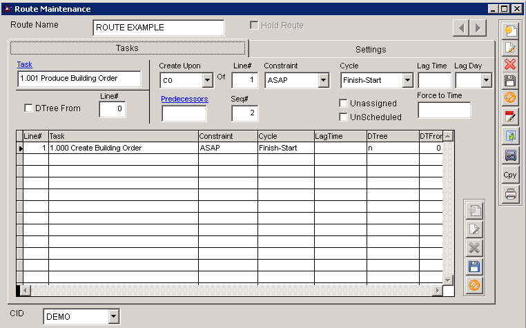 Once the route is saved, use the add/edit/delete/save/cancel buttons on the lower part of the screen rather than the upper part. Select add and enter the task that will come first in the route. Select the other options for that task and hit save. The first task must always have a Seq# of 1.