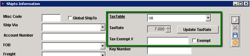 The user can get to the tax table master by either clicking on the TaxTable label on the shipto screen or through the menu Maintain>> Sales Tax>> Tax Table Master