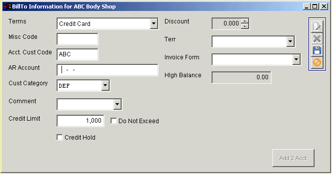 Acct Cust Code: The customer code used for accounting; the A/R Customer Code in your accounting software package.