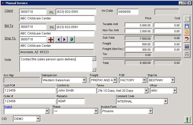 Function Manual Invoice screen generates an invoice with a Description, Item Number, Price, Order Number, including Bill To, and Sold To information.