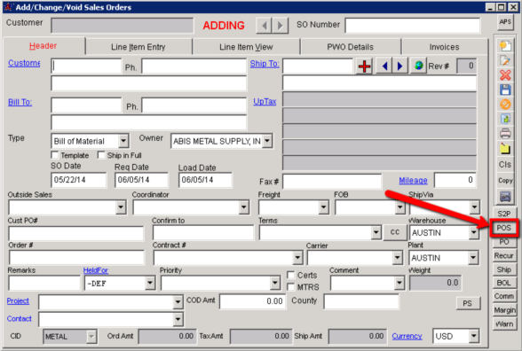 Default Menu Location The POS (Point of Sale) image is located on the bottom right hand toolbar of the Sales Order Screen