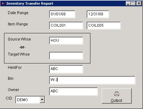 Inventory Transfer Report screen allows users to generate itemized inventory transfers from one location to another.