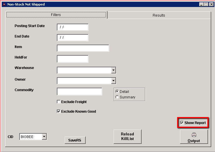 Function The purpose of this report is to provide a list of non stock items that have not been shipped. The screen has a second, Results tab which allows for edits to the report lines from a grid view. The screen will default in report mode which generates a detail or summary listing as shown below.