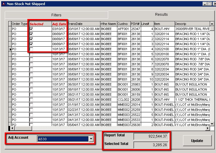 With the Show Report option de-selected, the Output button will display the results in a grid view. This Results tab is interactive when run in Detail mode and allows you to select the rows to add the document to the non stock not shipped report kill list rule (which removes the line from the report) and simultaneously make a GL adjustment to credit the non stock GL account and debit the extended cost of each selected line to the account selected.