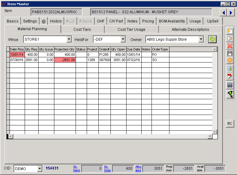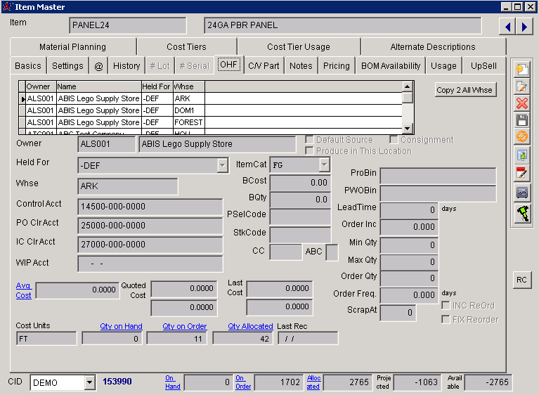 Qty on Hand: Current quantity on hand based on Owner/Held For/Whse