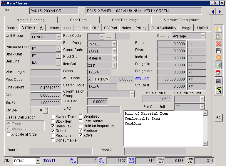 Item Master - PricingPricing tab displays the item's base cost, list sale price, margin between the two, and all of the pricing rules that are currently applied to it.