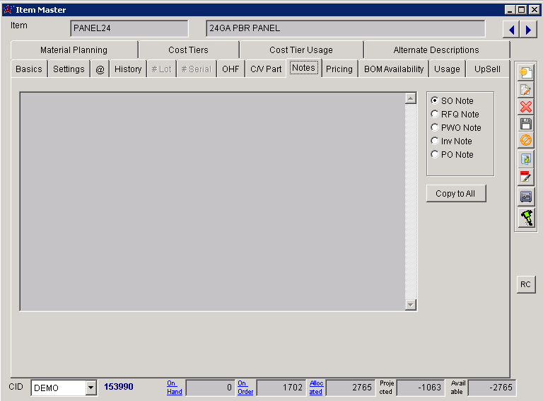 Notes tab is used to enter notes about the item. These notes will be displayed on purchase orders, quotes, sales orders, and invoices.