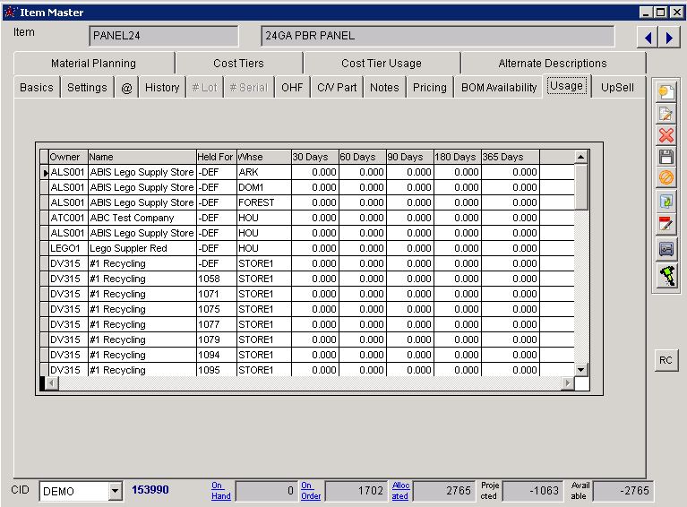 Usage tab displays the usage of items in 30, 60, 90, 180, and 365 intervals.