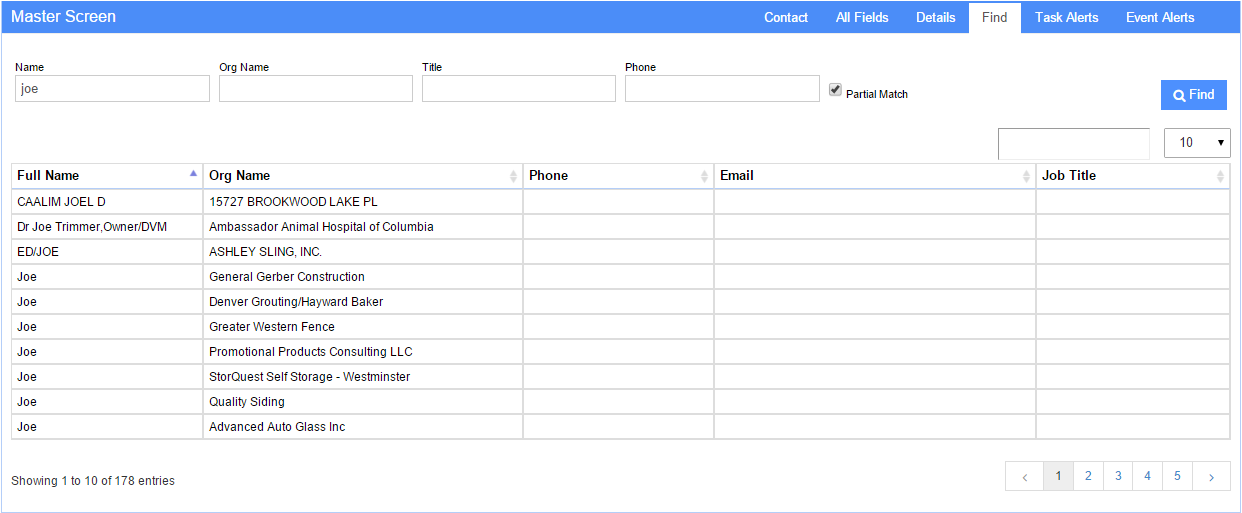 "Find Now!"The results grid at the bottom of the screen will be populated with all of the matching information. Then to view any additional information assciated with a contact in the results double-click on the contact, to be directed to the Main tab.