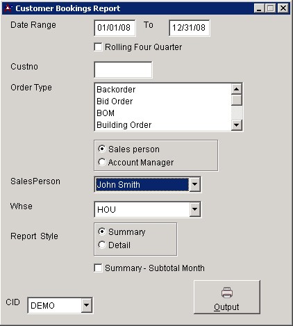 Customer Bookings Report displays Sales Orders by type, by company, and their spending per year.