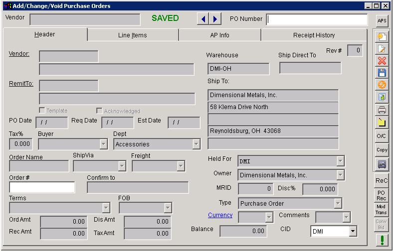 Function The Purchase Orders Screen is used to add, edit, and void purchase orders. The Header tab is used to enter the basic information that starts a purchase order.