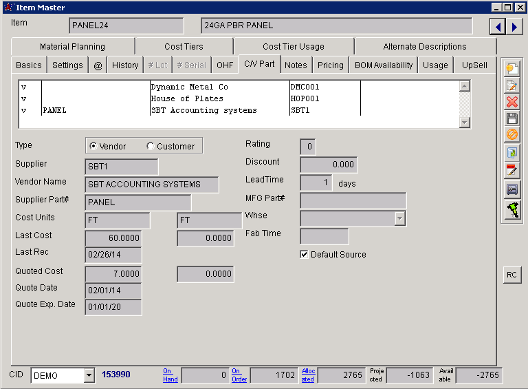 The Customer/Vendor Part tab is used to maintain vendor and customer part numbers for your item codes.