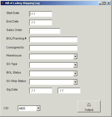 The Bill of Lading Log prints a summary report of bills of lading that have been generated.