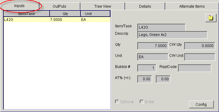 Outputs tab is used to enter/display the yield, or output of the components entered in the Inputs tab.