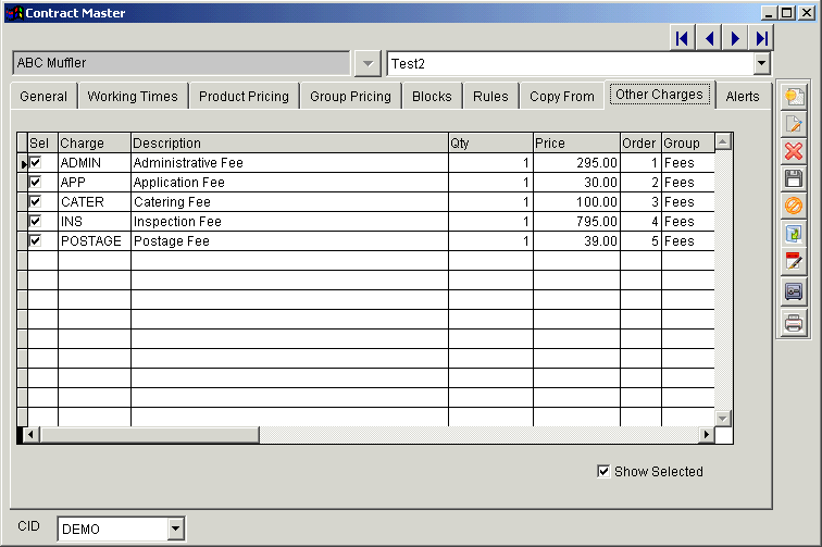 - Select the charges you wish to allow by checking the box located in the first column (You may also enter a default quantity and price)