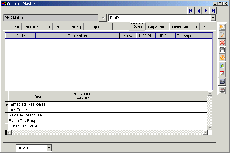 | + | '''Rules''' tab is used to define the rules associated with Trouble Codes and the response times for Task Priorities. | ||