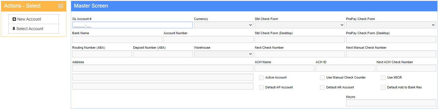 Default Menu Location: Maintain >> Accounts Payable >> Cash/Checking Accounts