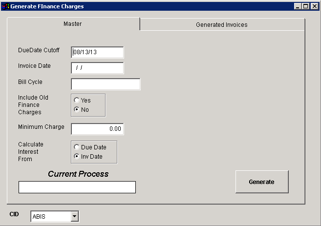 Function: This screen will allow users to generate finance charges on outstanding AR invoices based off the Annual Rate entered on the Customer's BillTo attribute.