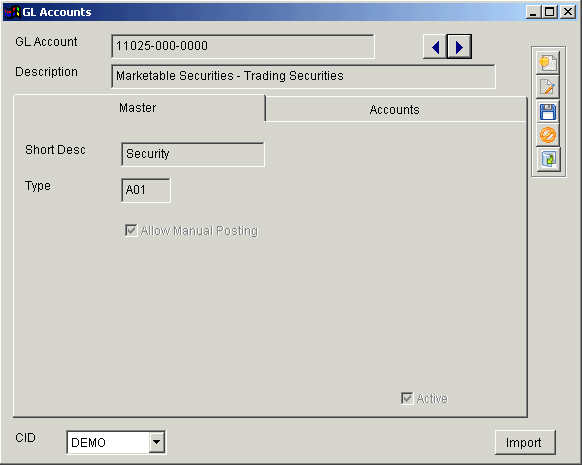 Maintain ==> System ==> GL Account MasterThe GL Account Master allows you to import all accounts into Adjutant and allows Adjutant to easily validate any accounts you enter in other screens.