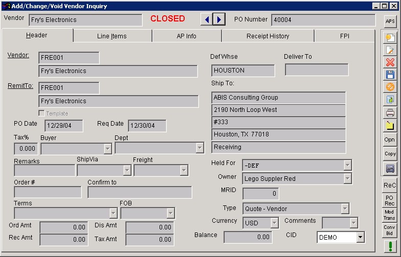 This screen is used to generate vendor inquiries (Bid PO) for stock items or for items specifically on open customer quotes.