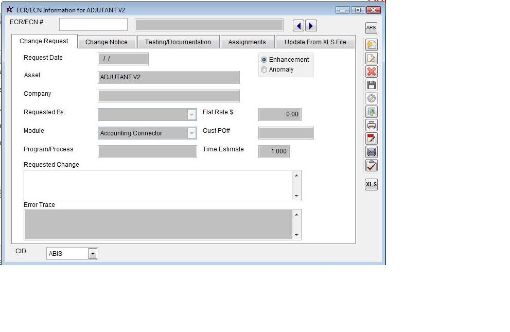The Engineering Change Request Notice screen allows requests for changes, assigning the request, tracking completed changes, testing and importing ECR records.