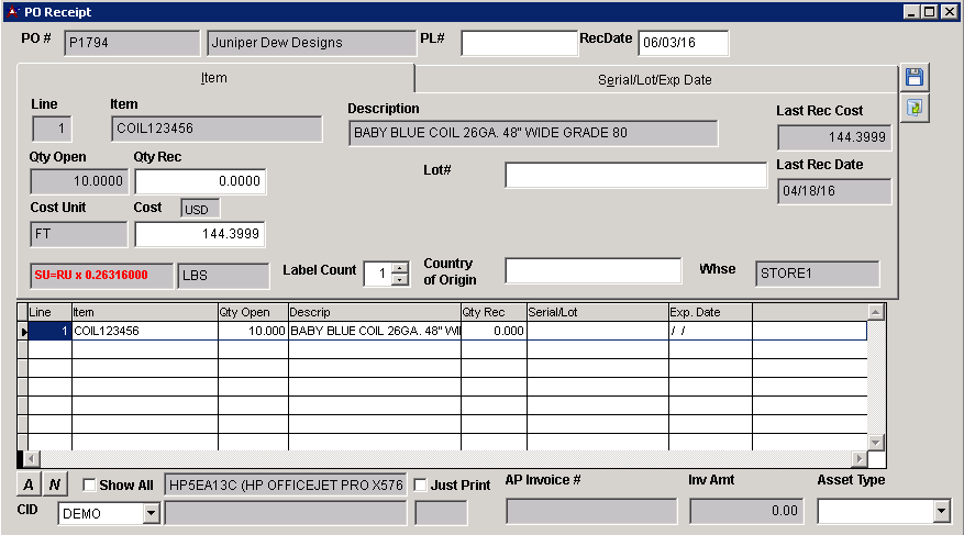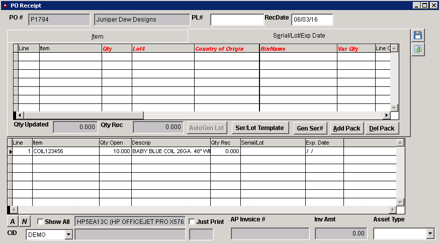 PO Receipt Serial/Lot/Exp Date Tab |
