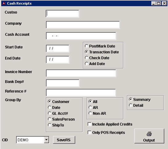 Function The Cash Receipts Report is used to show payments received into the company. The report has various filters that are used to report on specific customers, accounts, dates, or invoices.