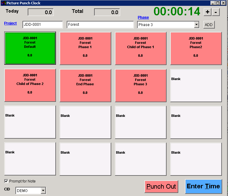 Function: The function of the picture punch clock is to provide fast and easy time entry for up to 16 total of different project and phases.