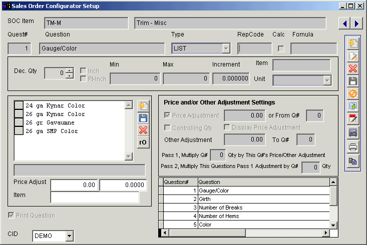 The Sales Order Configurator Setup screen is used to set up options/questions for configurable items.