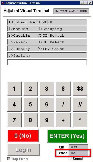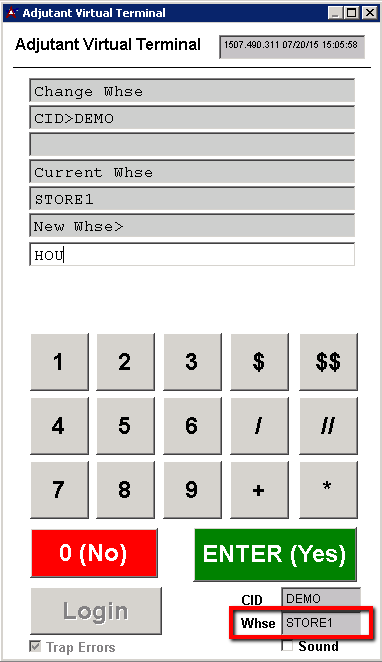 To change warehouses, enter 35 on the terminal and then type in the name of the Warehouse.