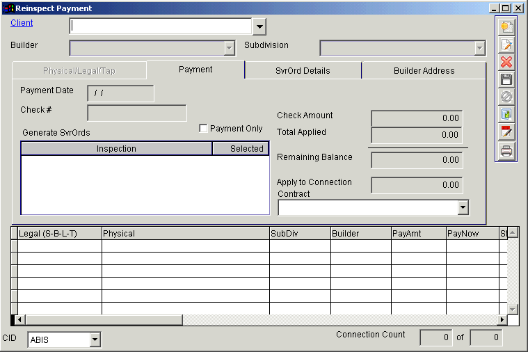 Reinspect Payment screen is used to track payment info and generate re-inspection service orders.