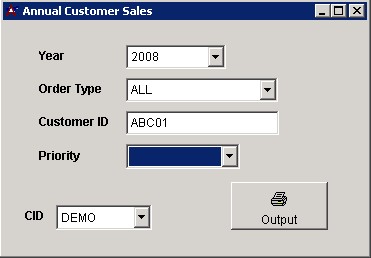 Annual Customer Sales screen generates a sales report for a specific customer or all customers for the year requested.
