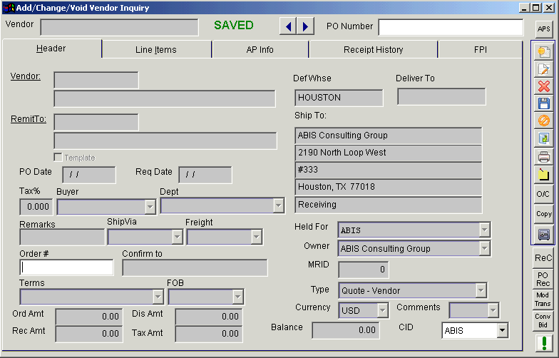Rec Whse: The warehouse the items are to be received into. Warehouses are set up in the Warehouses screen.