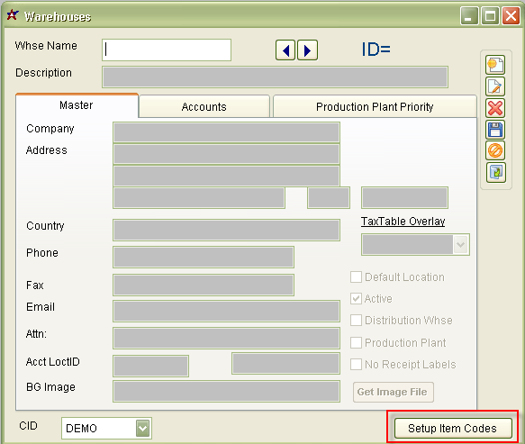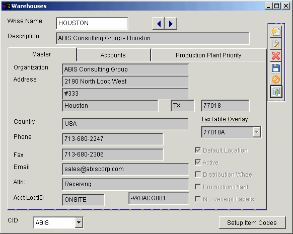 Default Location: Check this box if the warehouse is the default warehouse for the CID selected. Active: Check this box if the warehouse is active. Leaving this box unchecked will cause the warehouse to be unusable.